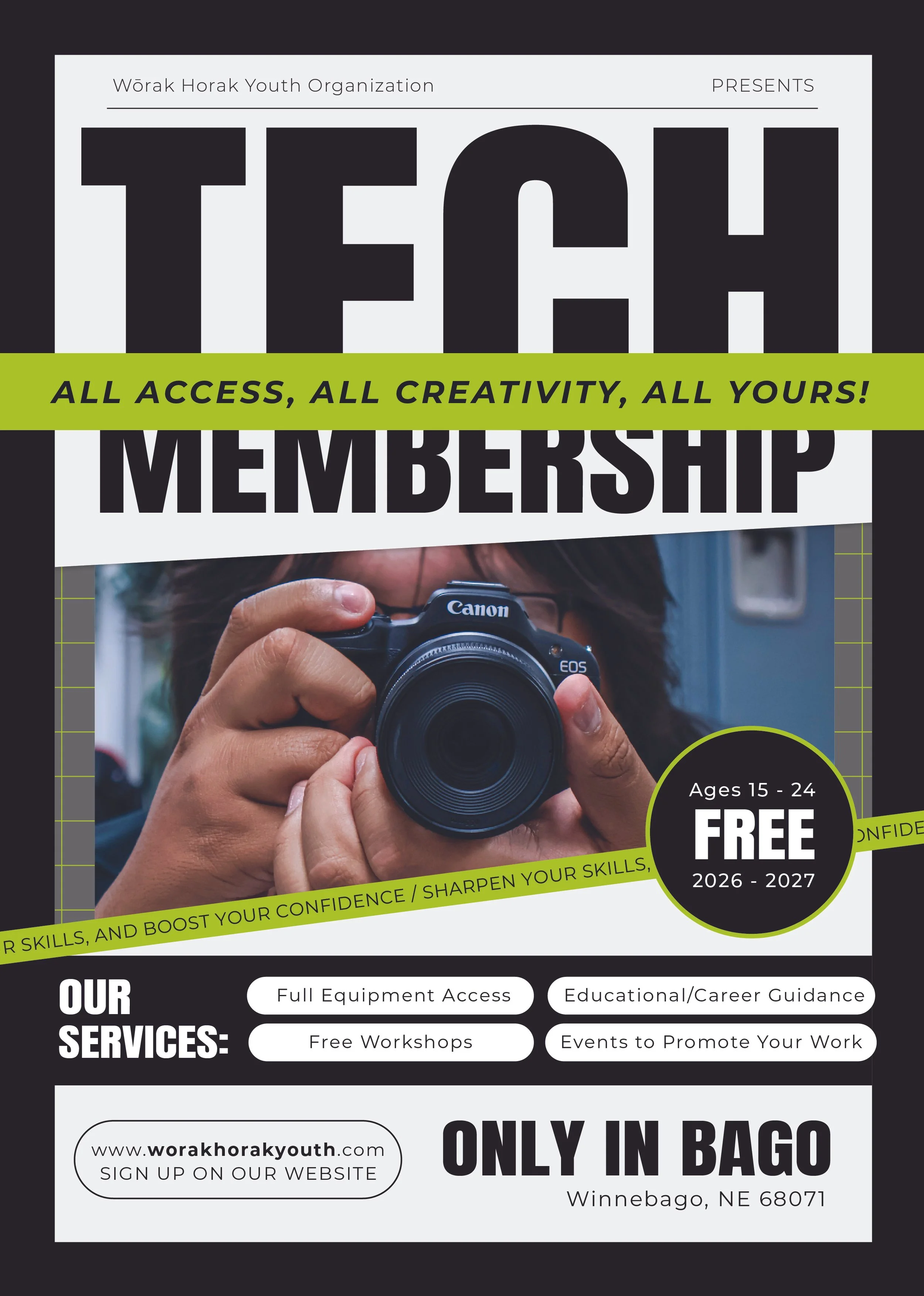 A community-centered membership giving Winnebago youth access to film, media, and tech equipment—while teaching responsibility, storytelling, and creative leadership.